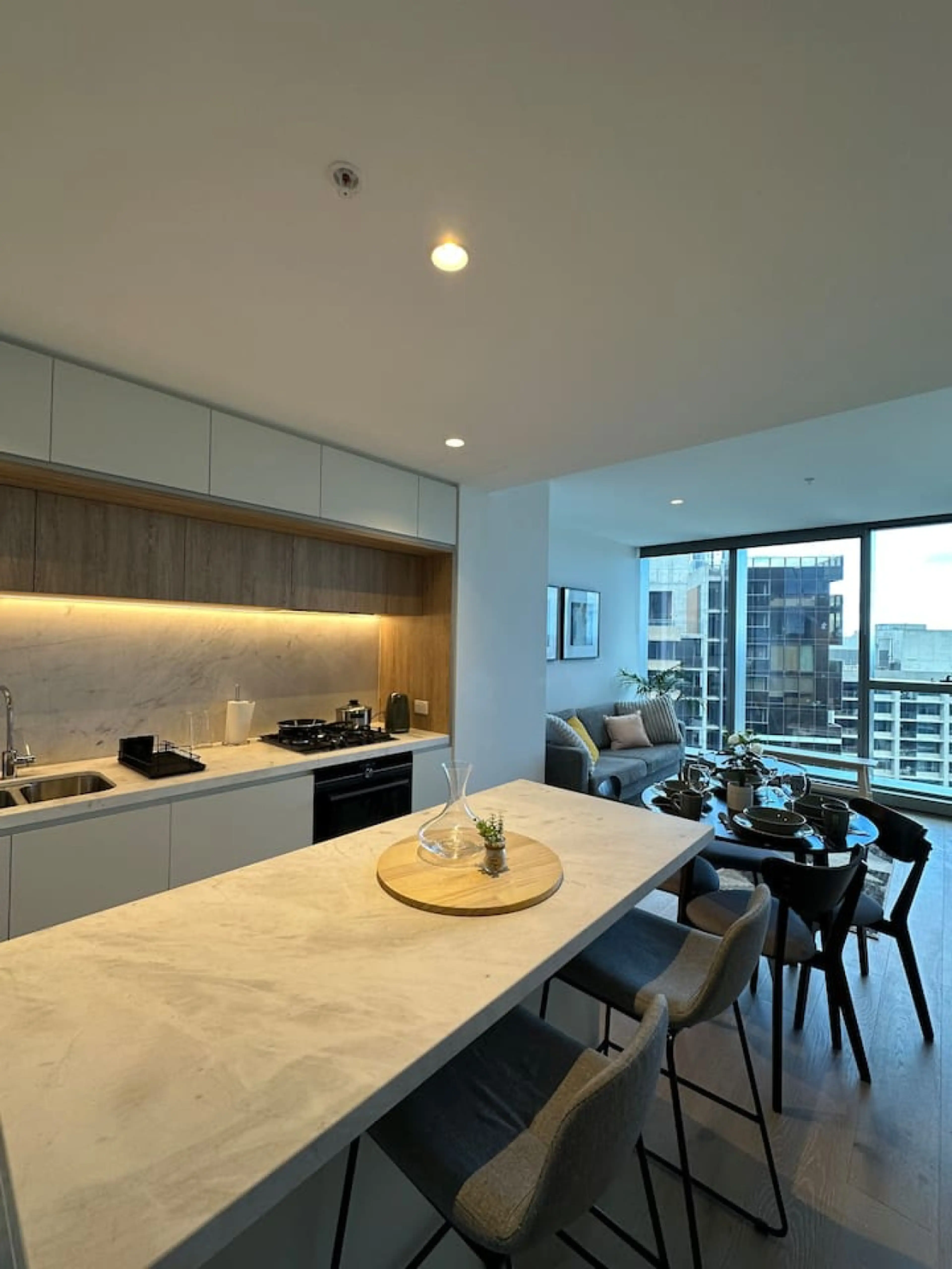 Experience the best of Melbourne from this spacious 2-bedroom, 2-bath apartment that fits up to 6 people with stunning city skyline views. Located just steps from Marvel Stadium, Docklands, Southern Cross Station, and top food, shopping, and entertainment spots. Perfect for footy weekends, concerts...